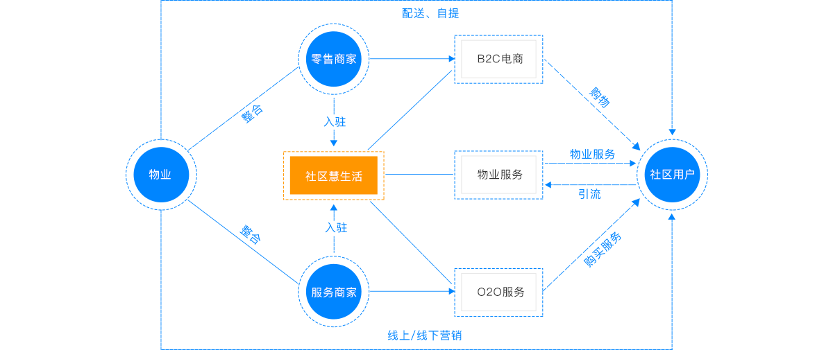 社區(qū)新零售是以物業(yè)服務(wù)為切入點(diǎn),以小區(qū)為單位,整合優(yōu)質(zhì)零售商、服務(wù)商入駐”社區(qū)慧生活“綜合服務(wù)平臺(tái),為社區(qū)居民提供日常物業(yè)服務(wù)、商品購買、生活服務(wù)的一種集中化運(yùn)營管理的商業(yè)模式,幫物業(yè)跨界轉(zhuǎn)型為社區(qū)商業(yè)的集成商。零售商家、服務(wù)商入駐”社區(qū)慧生活綜合服務(wù)平臺(tái)“即可在APP端進(jìn)行商品、服務(wù)的售賣,并且可由物業(yè)配合在合作社區(qū)開展線下營銷活動(dòng)、廣告發(fā)布,雙劍齊下,搶占社區(qū)消費(fèi)紅利。